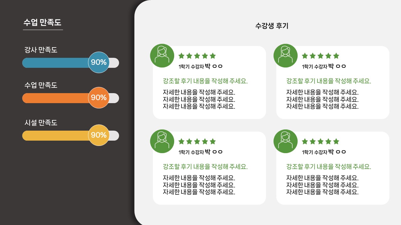 만족도 설문 결과, 또는 수강생의 성적 향상률 등
