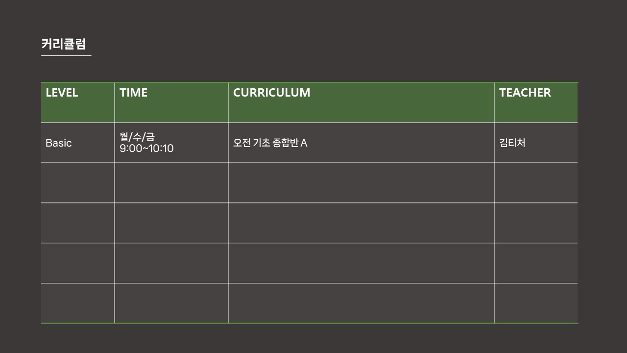 내용과 상세 설명을 넣어 커리큘럼을 보여줄 수 있어요.