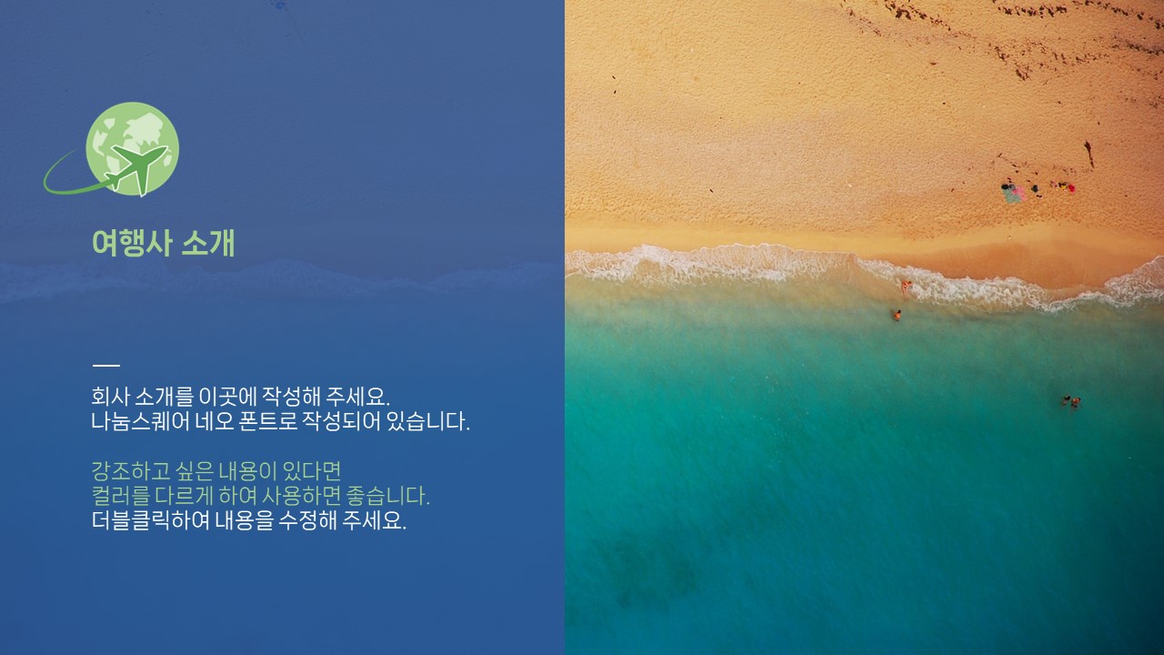 여행사 로고, 슬로건 등을 넣어 프레젠테이션의 시작을 시원하고 감성적으로 보여주기에 정말 좋아요.