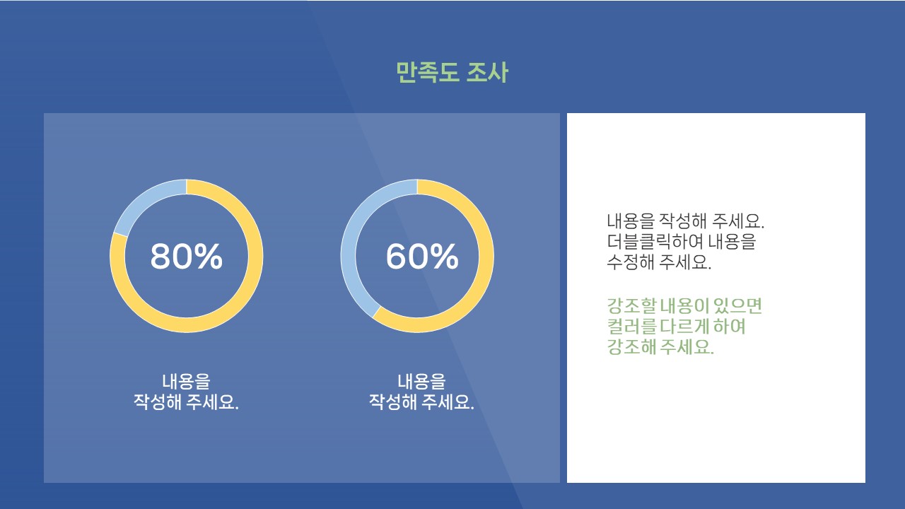 이 슬라이드는 만족도 조사 결과를 그래프나 주요 수치로 요약하여 보여주는 데 최적화되어 있어요.